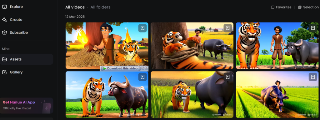 "The golden-orange tiger with black stripes, now marked with permanent dark scorch marks along its body, sits panting at the edge of a dense jungle. Its large muscular body is still strong but now humbled. Its deep amber eyes reflect realization and fear. In the distance, a small figure—the farmer, standing confidently beside his loyal, dark gray buffalo—watches from the rice field. The tiger, once arrogant, now understands the power of human intelligence. The background is a mix of golden rice fields and the deep green jungle, with the setting sun casting long shadows."Bước 5. Lần lượt sao chép từng câu lệnh (promt) này vào công cụ hailuoai.video ở trang web https://hailuoai.video để đăng kí một tài khoản miễn phí và bắt đầu tạo video.